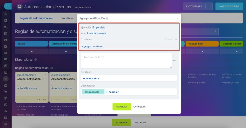 La configuración de estas reglas debe ser precisa para asegurar que las acciones automatizadas se ejecuten según lo previsto y contribuyan a mejorar la eficiencia operativa.